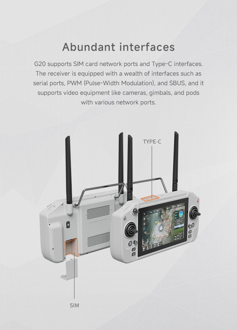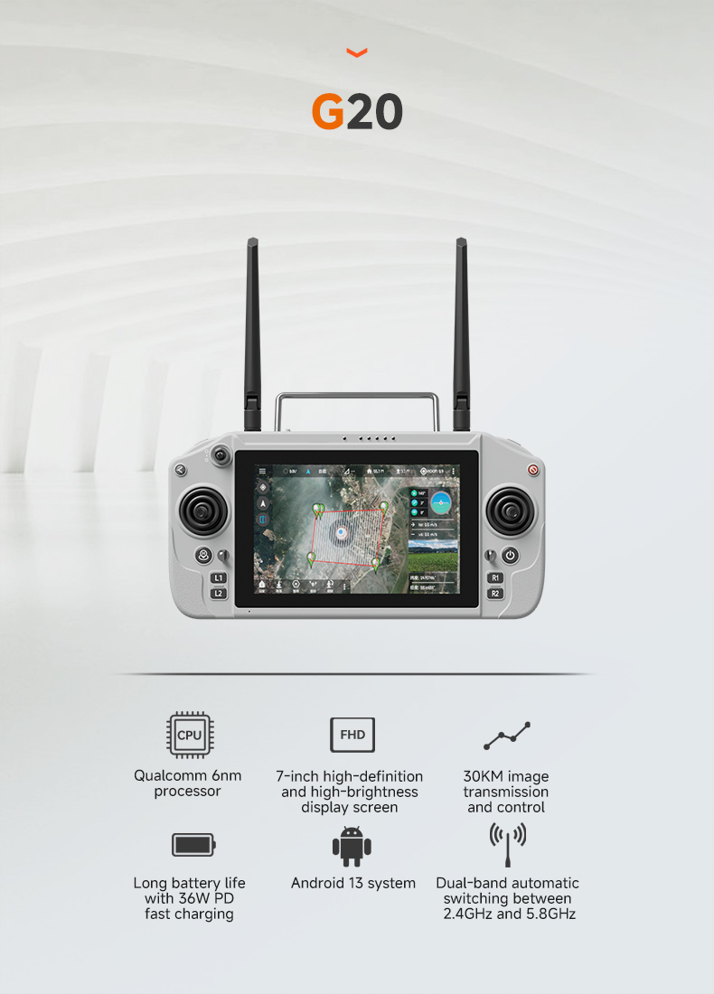 Skydroid G20 – profesjonalna stacja naziemna dual-band 2.4/5.8GHz, 16 kanałów, zasięg do 700m (CE). Ekran 7″ FHD (1920×1200), Android 13, Qualcomm 6nm, bateria 20000mAh (6-8h). Odbiornik GR01 w zestawie (opcja: GR03 premium). Współpracuje z EXTREME ONE – echogram, autopilot i podgląd z 3 kamer na jednym ekranie!
